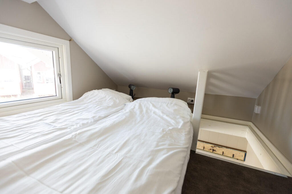 The sleeping loft sleeps two. The mattresses are pushed together to make a double bed. The loft is great, as you can keep the bedding out of sight and do not have to make the beds. During the day, the loft is a nice place for a rest. There are a window in the loft, where you can watch the world go by. The loft beds consist of mattresses placed on wooden slats on the floor.