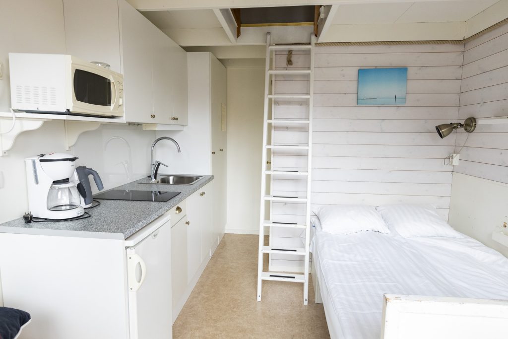 Stugorna är små till ytan och ligger tätt tillsammans som riktiga sjöbodar, vilket barnen tycker är jättemysigt. De är smart planerade för att få plats med allt man behöver under semestern. Standarden är enklare än hemma vilket gör att livet blir okomplicerat och man kan koppla av under semestern.